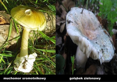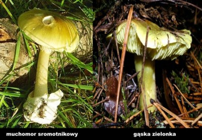 Myślę, że pomyłka dotyczy przede wszystkim kwestii; muchomor sromotnikowy, a gąska zielonka, poniżej małe porównanie. Faktycznie minimalne podobieństwo jest, ale to naprawdę małe i trzeba być chyba ślepym, żeby nie potrafić odróżnić tych grzybów. A już co się tyczy kani, to szok, jak te dwa gatunki można pomylić No ale jak komuś tylko się wydaje, że zna grzyby . To potem skutki są takie, o których słyszymy czy czytamy w mediach.