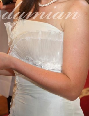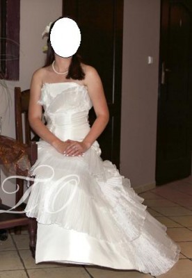 Suknia była czyszczona w profesjonalnej pralni chemicznej. Nie ma śladów użytkowania jest czysta i czeka na swoja nową właścicielkę. Suknię sprzedaje, ponieważ szkoda żeby się marnowała i wisiała bezużytecznie w szafie a mogłaby uszczęśliwić niejedną Panią Młodą.