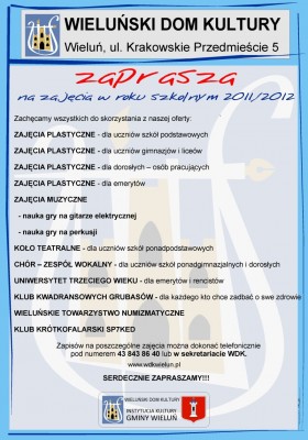W zależności od zainteresowania istnieje możliwość uruchomienia zajęć ogólnorozwojowych, plastycznych lub początkowego języka angielskiego. Niestety, ze względu na konieczność zatrudnienia osoby prowadzącej, zajęcia te będą odpłatne. Kwota będzie zależała od ilości dzieci uczestniczących w zajęciach. Pytania prosimy kierować pod numer telefonu 43 843 86 40.