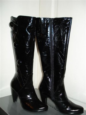 Nowe kozaki damskie Claudio Rosetti,czarne,lakierowane,roz.37,wys. obcasa 9cm, ocieplane, wys.cholewki 36cm,obwod 37cm.