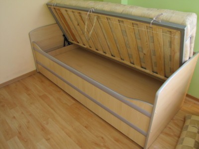 Ta plama, którą widać, to proszę się nią nie przejmować! Żona niemiała czasu tego wyprać, tak więc gwarantuję, że wystarczy zdjąć, włożyć do automatu i po sprawie. Oprócz tego niedawno (około 4-5 miesięcy do tyłu) kupiłem i zamontowałem nowe podnośniki. Ponadto mam także do kompletu szafkę z trzema szufladami. Stała ona przy łóżku, i jest dostosowana do niego (długość, szerokość, wysokość 88x30x67). Zamontowane są tam specjalne prowadnice szuflad, dzięki którym można natychmiast wyciągnąć szuflady na zewnątrz (nie znam się na tym, ale od spodu każdej z nich naciska się na dwa języczki i wtedy szuflada wychodzi z prowadnic). Cena za szafkę - 50 zł.