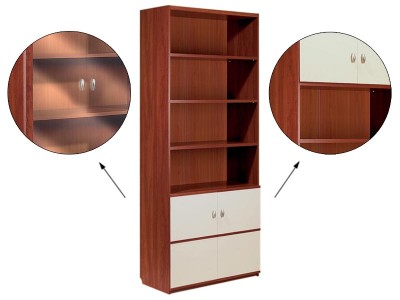 Regał można zaopatrzyć w szklane drzwi w środkowej części i w pełne w części górnej, dzięki czemu mebel może pełnić funkcję witryny w jadalni, pokoju dziennym, bądź zamkniętego, chroniącego przed kurzem regału służącego przechowywaniu książek w eleganckiej, nowoczesnej bibliotece domowej.