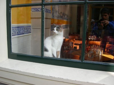 DSCN2940.jpg Amsterdam, centrum - Kociak w jednym z lokali wyglądający na tłumy przechodniów (przy okazji przypadkowy autoportret :P)