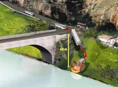 Niemal przy końcu tej drogi autor wszedł w 90-stopniowy zakręt z prawdopodobną szybkością 100 km na godzinę. Motocykliści jadący za polskim autobusem, widzieli dym i ogień świadczące o tym, że kierowca próbował hamować, ale hamulce nie zadziałały. Podpułkownik miejscowej żandarmerii Thierry Rousseau powiedział: - Świadkowie mówią o problemach z systemem hamulcowym, o niesamowitym czarnym dymie, wydobywającym się spod autokaru i o jego nadmiernej szybkości, która mogła być przyczyną tragedii.