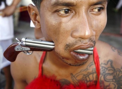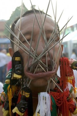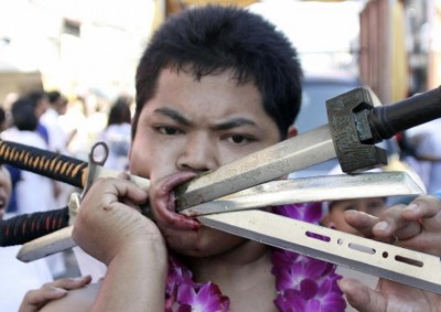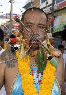 Na Festiwal Wegetarian w Phuket (Tajlandia) przybyli wierni chińskiej świątyni Bang Neow. Coroczne spotkanie ma oczyścić pielgrzymów oddających cześć swoim bóstwom, droga do oczyszczenia jest jednak bolesna – niektórzy przybyli podczas procesji ranią swoje ciała. Przebijanie policzków metalowymi narzędziami jest dowodem hołdu dla religii. Festiwal od lat cieszy się liczną publiką – turyści z całego świata zjeżdżają się do Phuket na dziewięć festiwalowych dni.