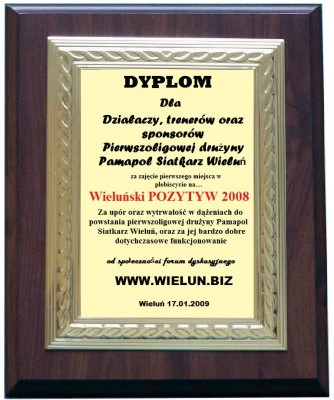 Podazajac sladami miko 005 (autor plebiscytu na wybor Idiotyzmu 2008) postanowilem stworzyc dyplom dla bohaterow naszego plebiscytu na Pozytyw 2008. Przed chwilka wyslalem go na oficjalny adres e-mail klubu Siatkarz Pamapol Wielun.